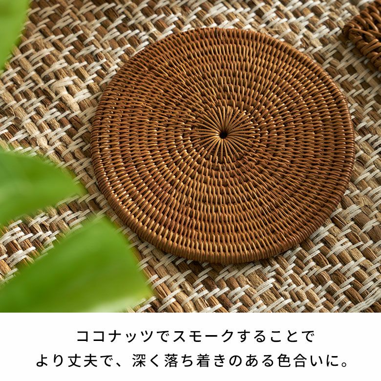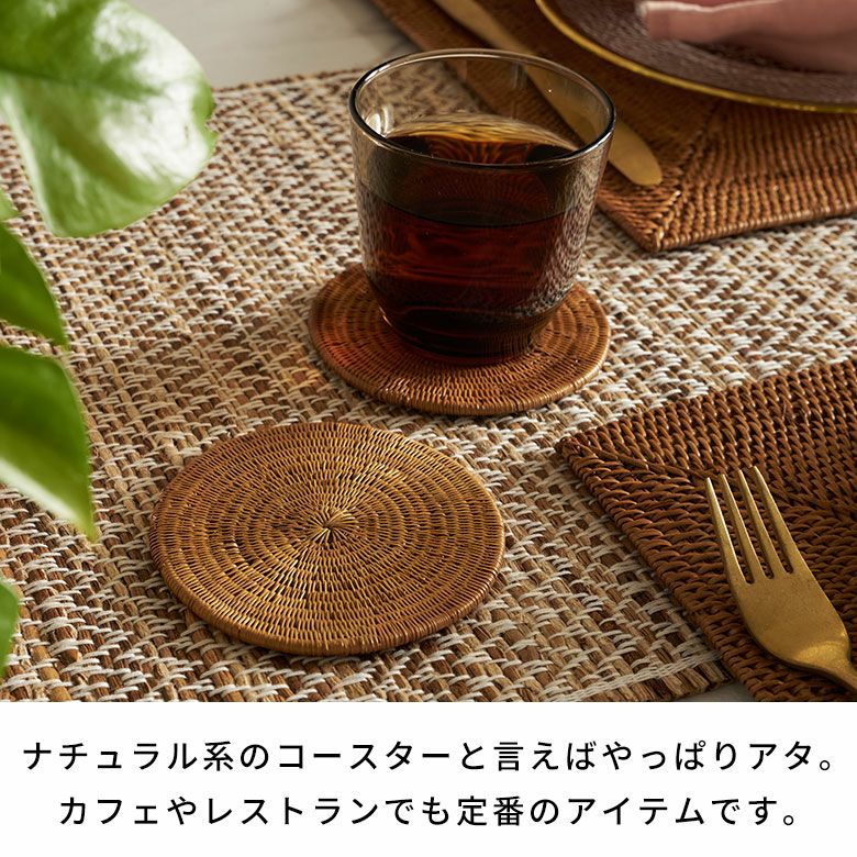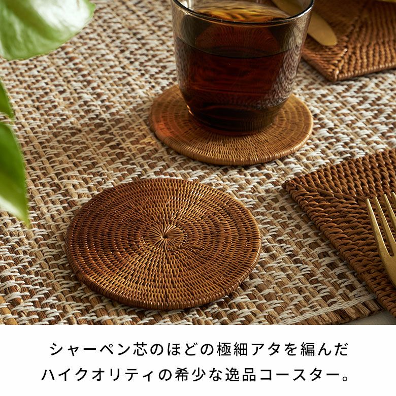 熟練の職人だけが編むことのできるスーパーハイクオリティの円形アタコースター。手作業で丁寧に裂かれた極細アタを編み上げ、ひとつひとつに職人の技と温もりが宿ります。