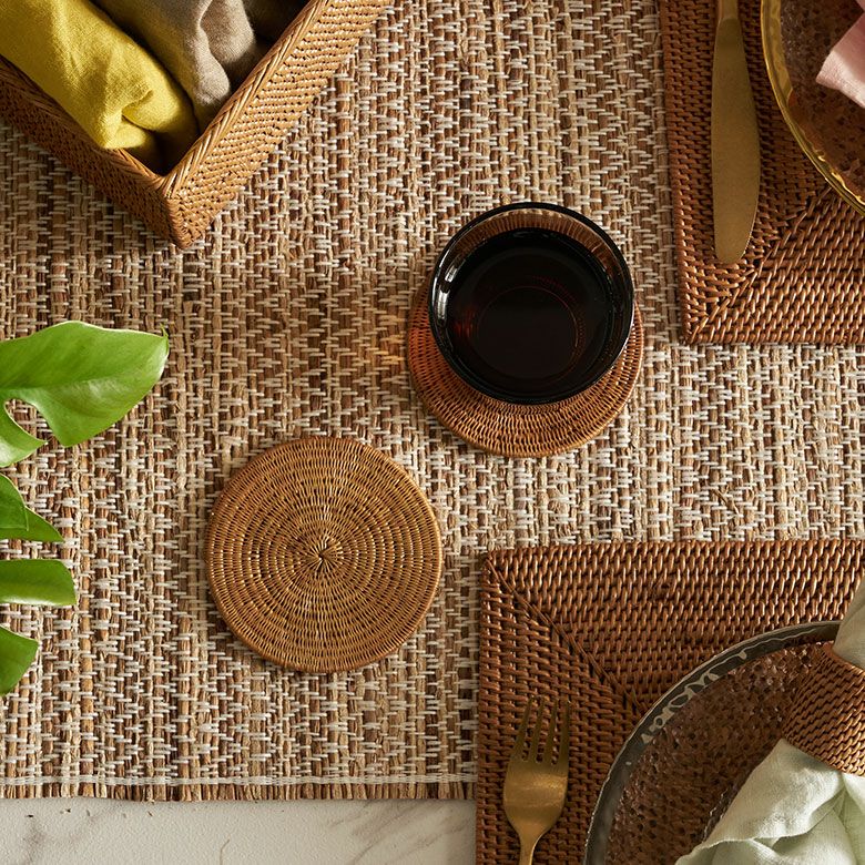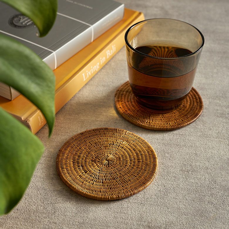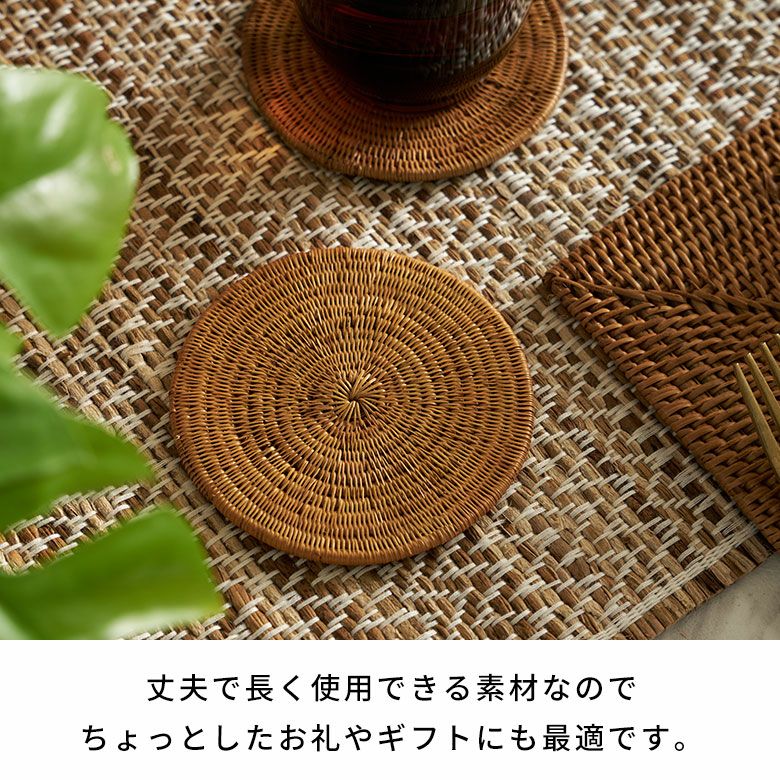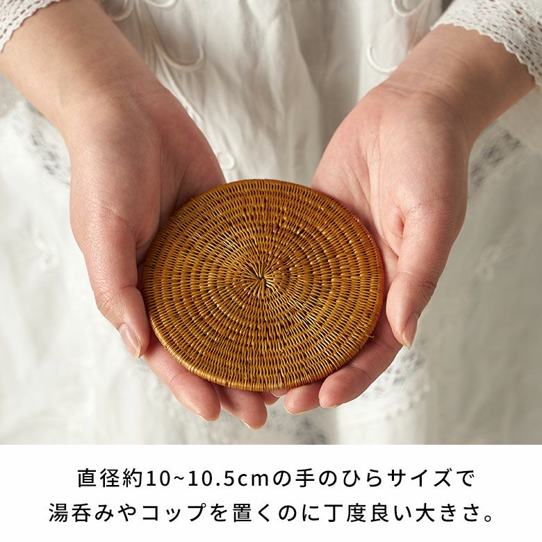 手編みの柔らかな曲線とナチュラルな風合いで、湯呑みから冷たいグラスまでどんな器にも自然に馴染み、食卓に上品なアクセントを添えます。さりげなくアジアンな雰囲気を演出します。