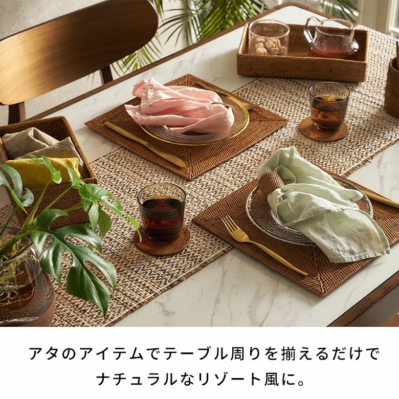 一般的なアタ(幅約1.5mm)に比べ、0.5mmの極細アタを使用。編み目はハイクオリティよりさらに密度を高め、熟練職人が集中力と高度な技術でひとつひとつ丁寧に編み込んでいます。円形のフォルムがテーブルで際立ち、特別なおもてなしやティータイムに高級感を演出します。