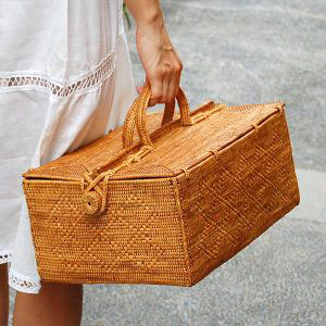 天然素材アタで編まれた3段ランチバッグは、独特の色合いと細かい編み目が特徴。