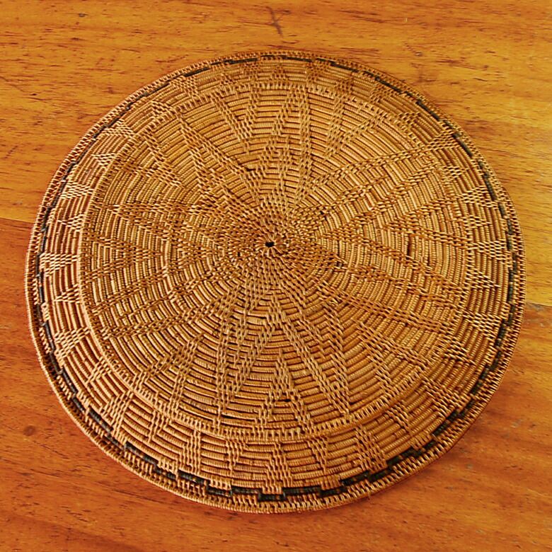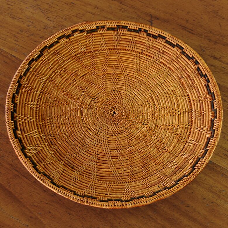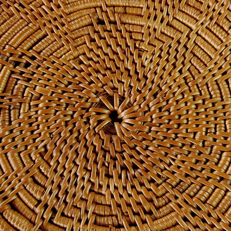 アタの編み方は独特で、ツルを芯にし、薄く削った表皮を巻き付けて固定していきます。少しずつ形を整えながら編み進めていくため、小さなコースター1枚でも数時間かかるほどの手間と技術が必要です。