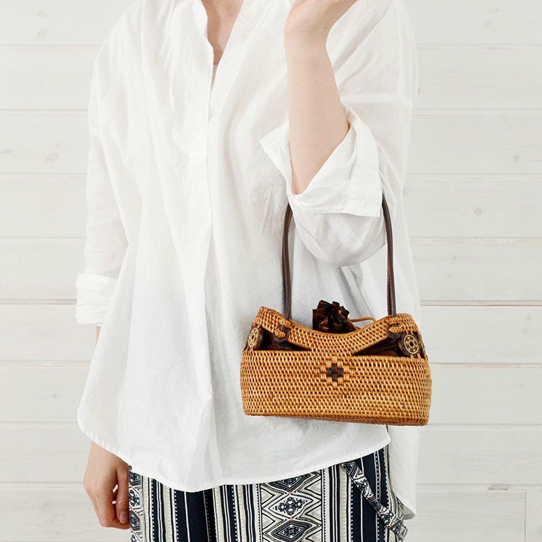 ナチュラル感たっぷり!人気のアタのカゴバッグ。アジアンリゾートスタイルや、浴衣や着物での使用はもちろん、自然な素材感が映えるピクニックなどでも活躍。