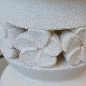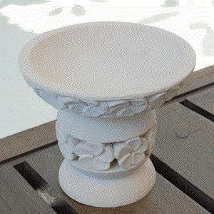 石像の町として有名なバリ島のバトゥブランの職人が白くて軽いホワイトパラスストーンを彫って作ったアジアンオブジェ。 丸い土台の上にプルメリアの花びらが彫られたお皿のようなパーツがのっている不思議なカタチ。お皿の直径が約15cmで高さ約12cmのサイズなので置く場所を選びません。 土台の花びらが彫られた部分は中が空洞になっていて立体的なデザインを一層引き立てています。 お皿の部分にプルメリアの造花などのオブジェをのせてもいいですね。 パラス石は透水性がありますので水を張ることはできませんのでご注意ください。