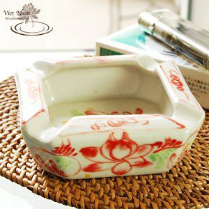 ベトナムで作られた、手書きの蓮が描かれた陶器の灰皿。