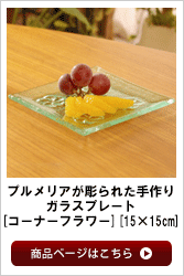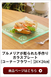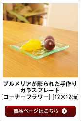 | ハンドメイドのガラスプレートは少し緑がかった透き通った綺麗で透き通った色合いです。 プレートのコーナーにプルメリアの花が描かれたシンプルで可愛いデザイン。こちらの プレートは食品衛生検査委済みですので、プレートの上に食べ物をおいてお使いいただけます。 朝食やランチライムにガラスのプレートを使うといつもの食卓が爽やかな印象に変わります♪さらにこれ一つで お部屋の雰囲気がよりアジアンなテイストに変わりますよ♪ | ||||