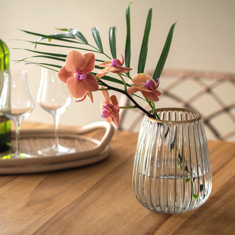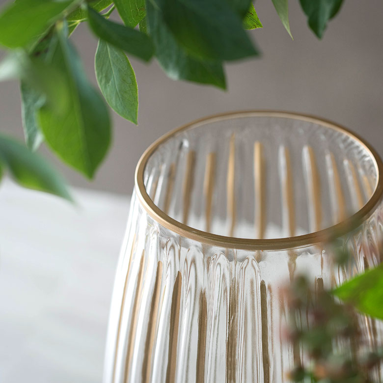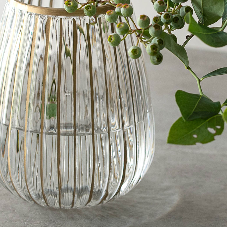 クリアのソーダガラスに、手書きのゴールドラインが映えるフラワーベース。