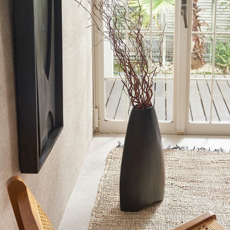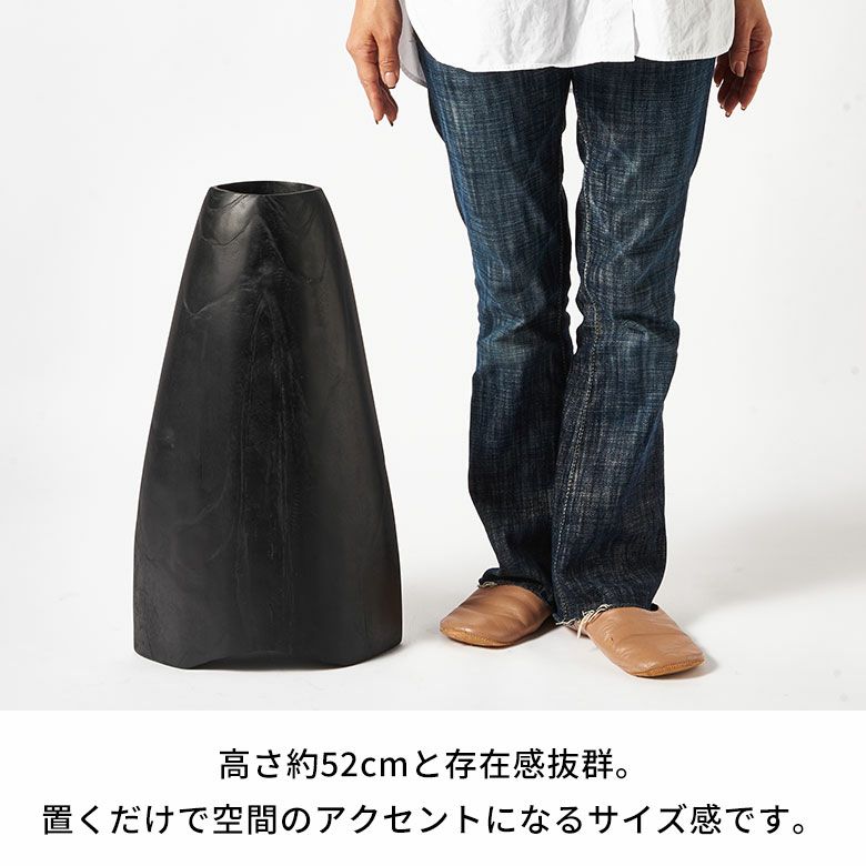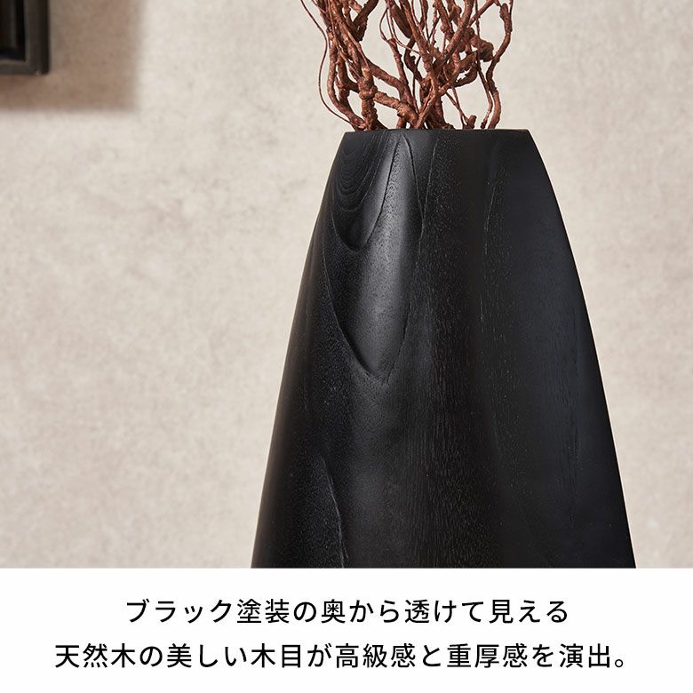 インドネシアの職人が一点ずつ丁寧に仕上げた、チーク材のフラワーベース。高さ約52cm、重さ約7キロと存在感があり、どこに置いても主役級のオブジェです。有機的な丸みのあるフォルムと、ブラック塗装が特徴的な花びんです。