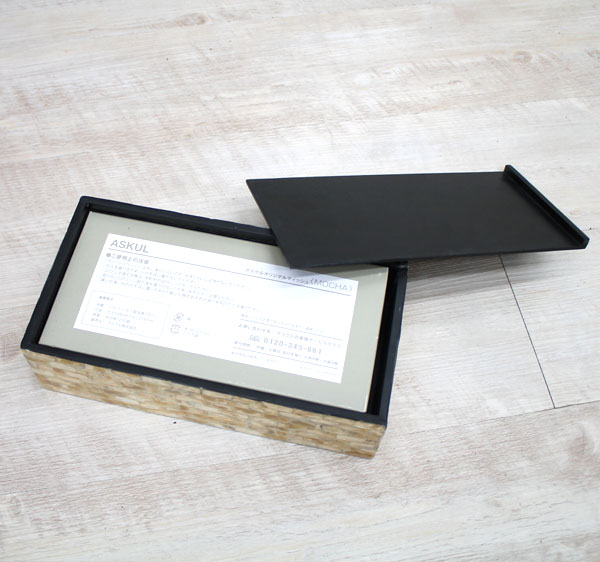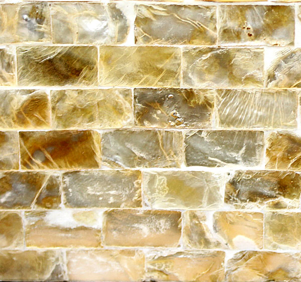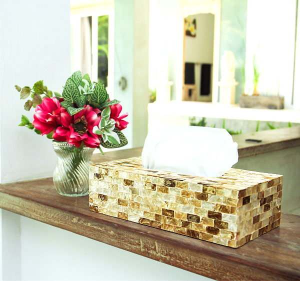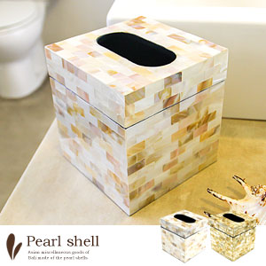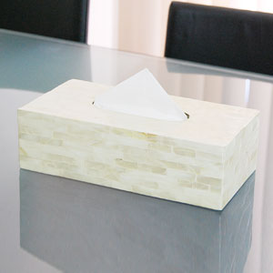 シロチョウ貝とよばれる真珠貝の殻を四角くカットし、モザイクのように貼り合わせたティッシュケースカバー。