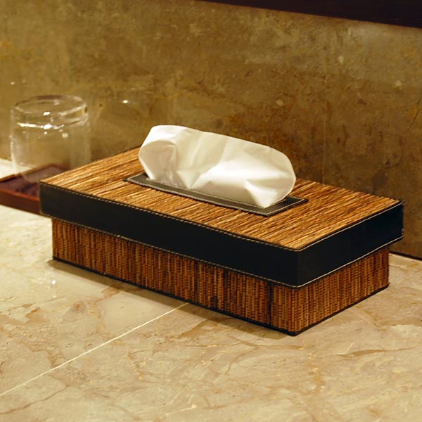 生活感の出やすいティッシュボックスもこのケースに収納すれば、まるでリゾートホテルのようなインテリアに。