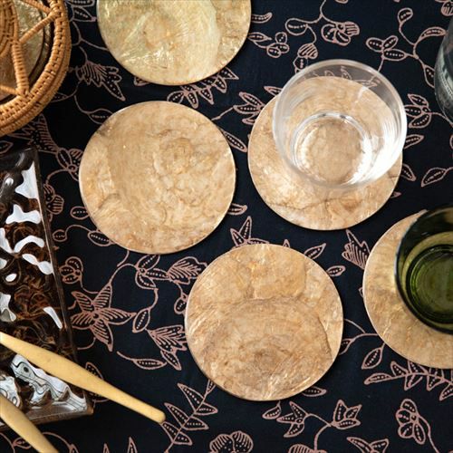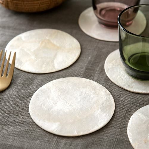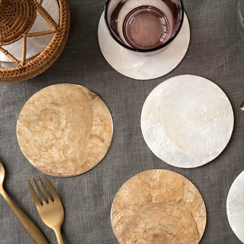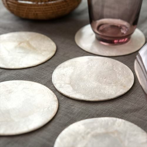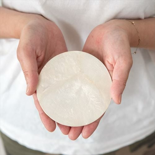 光沢のあるカピスシェルを薄く削り、貼り合わせて作ったコースター。