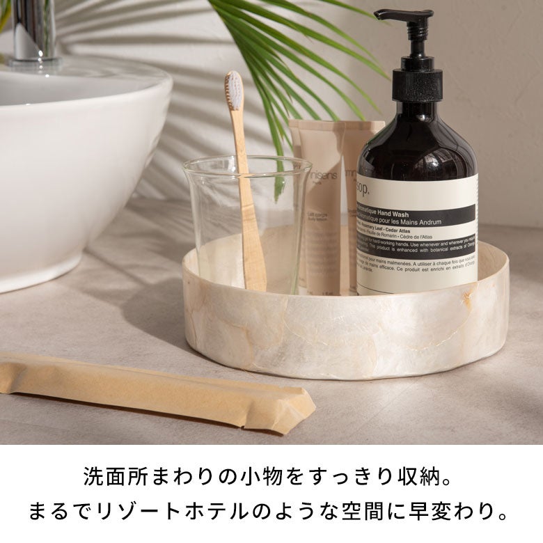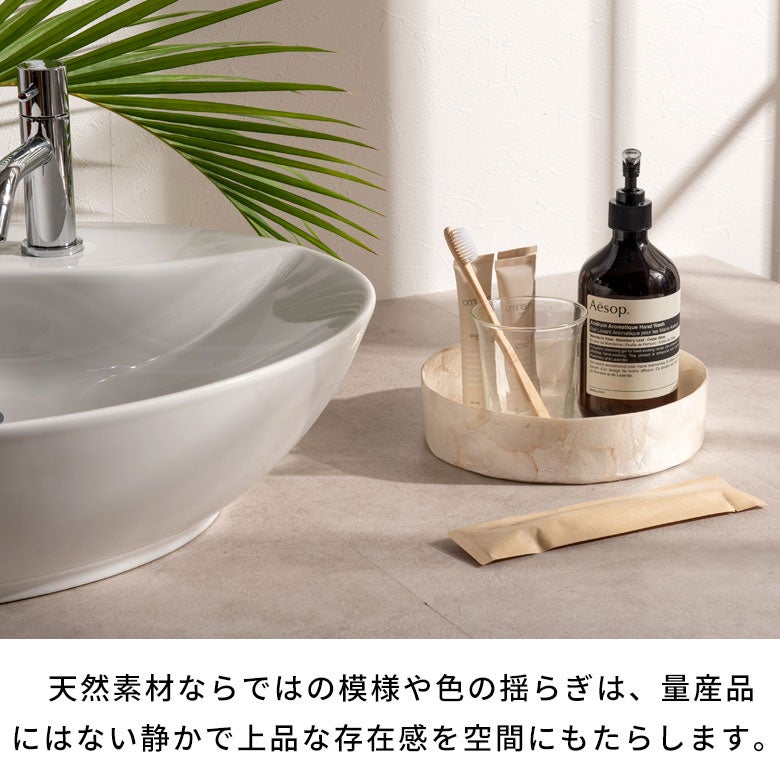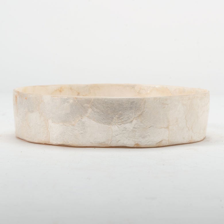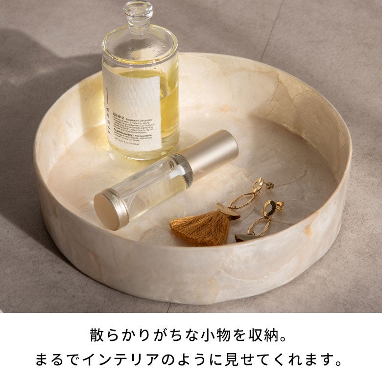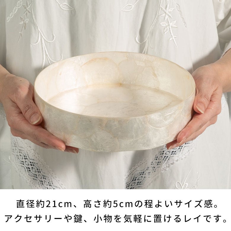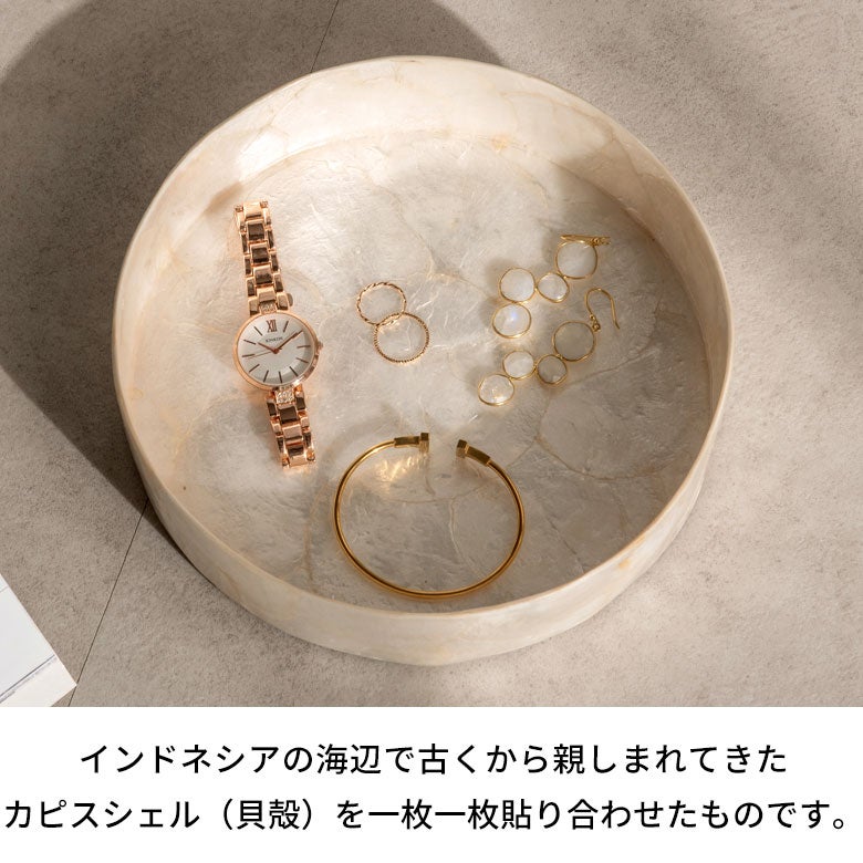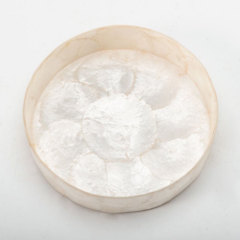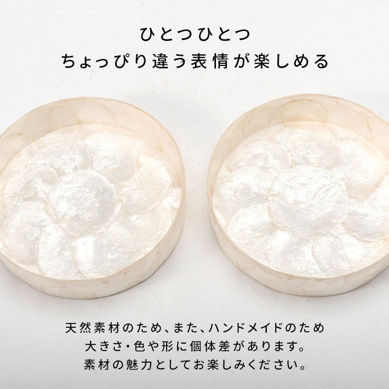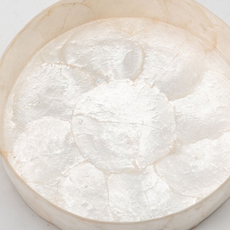 インドネシアの海辺で古くから親しまれてきた、カピスシェル(貝殻)。その自然素材を一枚一枚貼り合わせ、職人の手仕事で仕立てたラウンド型のトレイです。