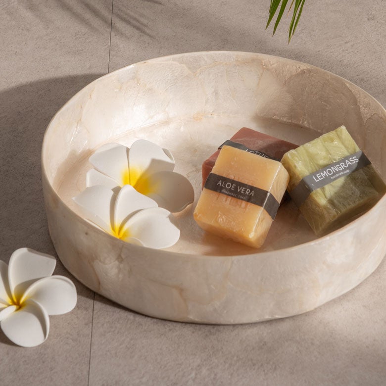 バリ島の海の恵みで育った天然素材、カピスシェル(窓貝)。光を受けるとやわらかく透け、上品で涼やかな輝きを放ちます。カピスシェルはトレイだけでなく、ペンダントライトやキャンドルホルダー、コースターなどにも用いられてきた素材。