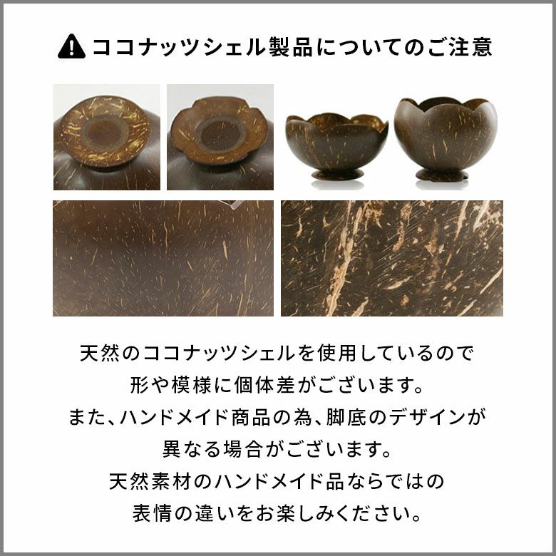 天然のココナッツシェルを使用しているので、形や模様に個体差がございます。