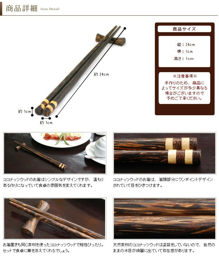 バリ島で見つけてきたココナッツウッドのお箸とお箸置きのセット。ココナッツウッド独特の木目と箸頭部分のワンポイントのデザインがとても美しく、シンプルありながら目をひく存在感があります。シンプルなデザインと素材のもつそのままの色は、アジアンテイストはもちろんナチュラルテイストにもあうお箸になっています。