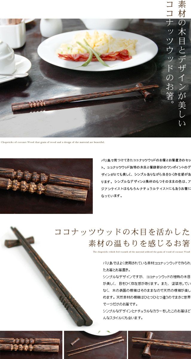 バリ島で見つけてきたココナッツウッドのお箸とお箸置きのセット。ココナッツウッド独特の木目と箸頭部分のワンポイントのデザインがとても美しく、シンプルありながら目をひく存在感があります。シンプルなデザインと素材のもつそのままの色は、アジアンテイストはもちろんナチュラルテイストにもあうお箸になっています。