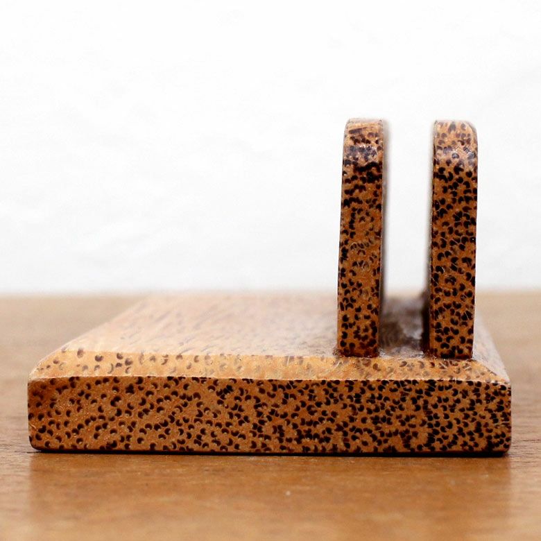 ココナッツウッドの質感を惹きだすカードスタンドは、シンプルなデザイン。