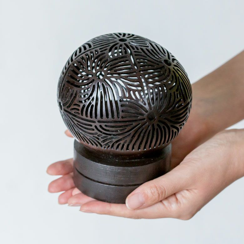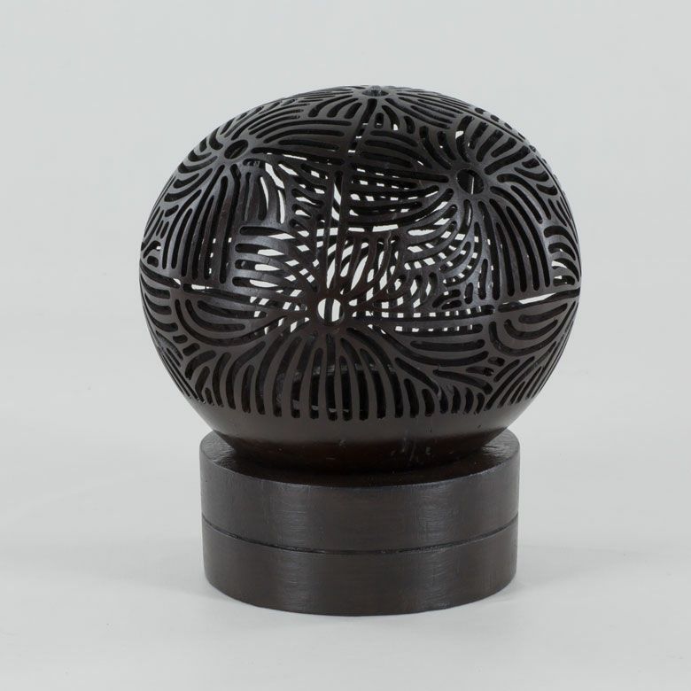 バリの職人がココナッツシェルに繊細なカービングを施した、テーブルランプ。