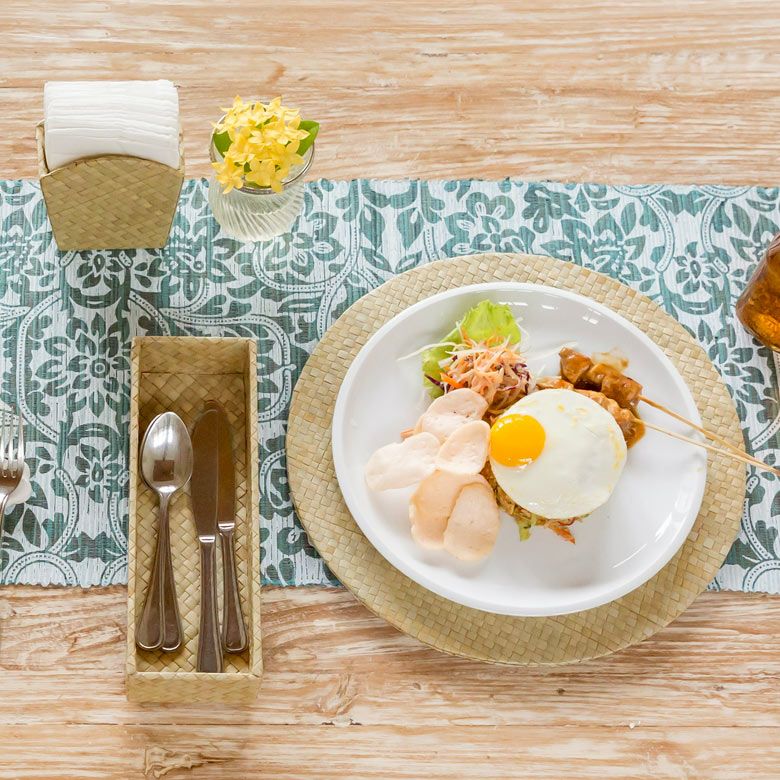 ブルーのテーブルウェアと組み合わせると、明るく爽やかな印象に ツヤのあるレザーのような質感、天然素材パンダン