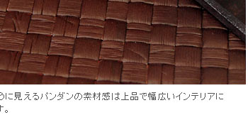 | バリ島の植物パンダンの葉を乾燥させて、色付けし、バリ島の職人の手で編まれたティッシュケースカバーは、ぬくもりと優しさに溢れたアイテム。 一見レザーのように見えるのがパンダンの特徴でモダンなインテリアにもマッチするシンプルなデザインですが、天然素材が存在感溢れるオシャレなティッシュケースカバーです。 パンダンとは東南アジアに自生するタコの木科の植物で、その葉を乾燥させたものを使って編み込みます。成長力が高く、エコロジーな材料としてバリ島では古くから使われる素材です。 パンダンのティッシュケースカバーの中でも上品な雰囲気に仕上がったアイテムです♪ | |||||