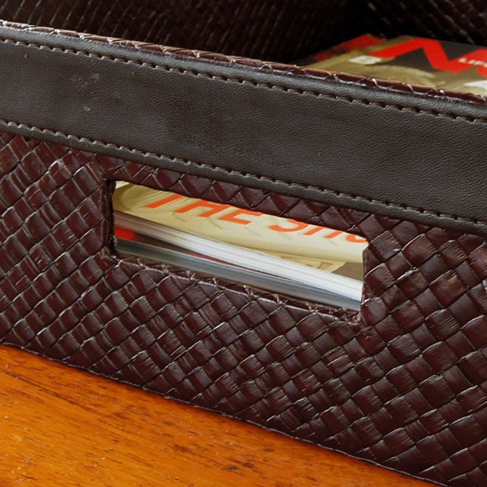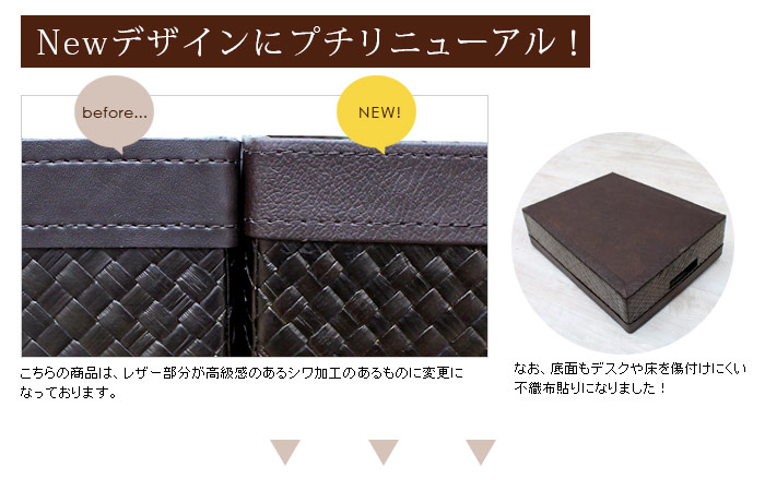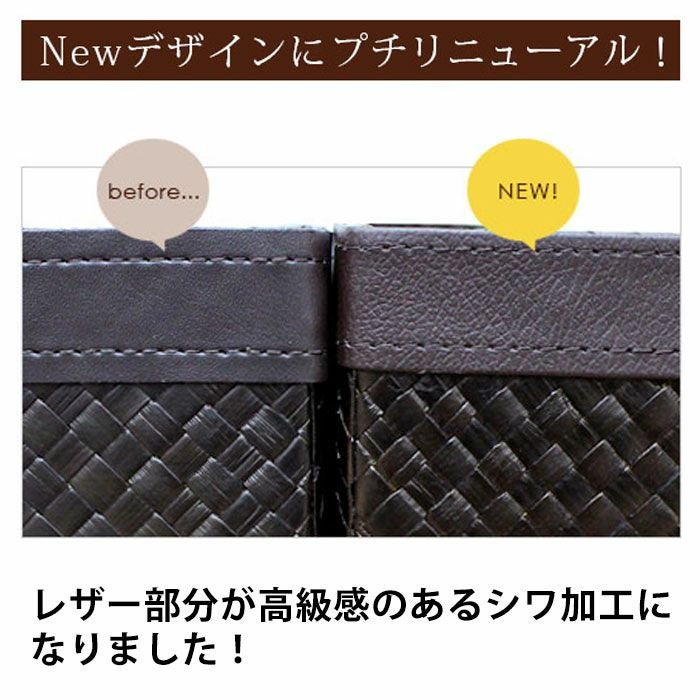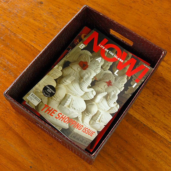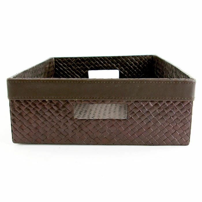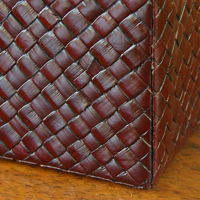 | こちらはレザー(革)のようにも見えますが、じつはこれパンダンという植物の葉で編まれているんです。パンダンとは東南アジアに自生するタコの木科の植物で、その葉を乾燥させたものを使って編み込みます。成長力が高く、エコロジーな材料としてバリ島では古くから使われる素材です。 ダークブラウンのカラーリングがアジアンはもちろんモダンなインテリアにもマッチするので幅広いシーンでお使い頂けるアジアン雑貨です。サイズも大きく収納力があり、リビングの散らかる小物をこれ一つにまとめることができます。 上部のレザーとも相性がいい可愛いデザインです。 | |||||