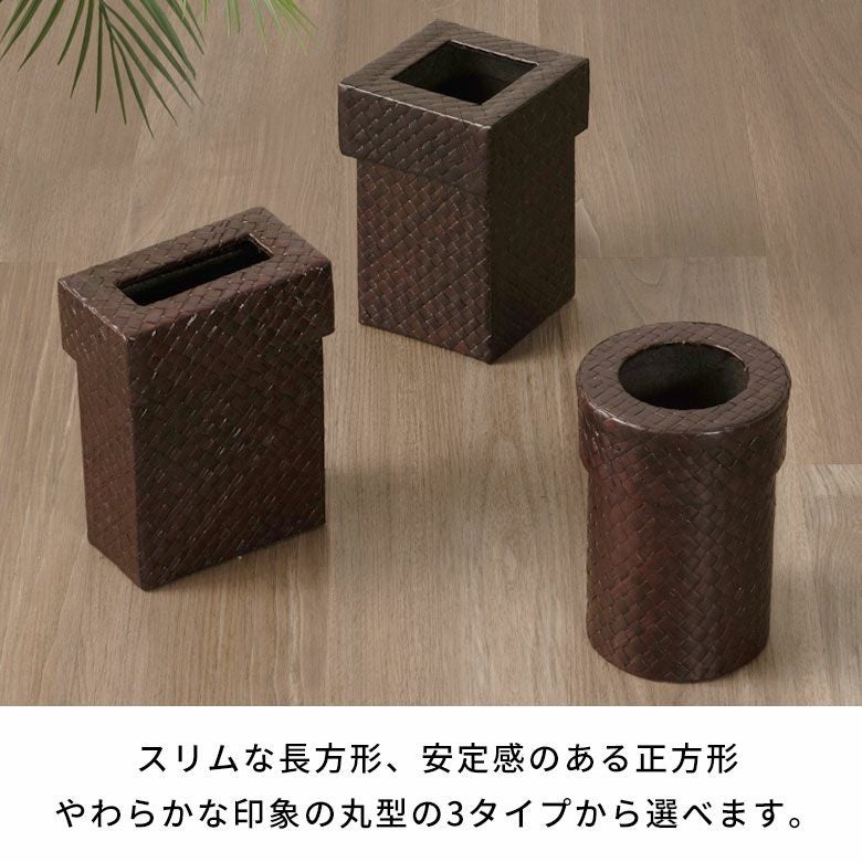 バリ島の職人が丁寧に編み上げた天然素材パンダンを使用。プラスチック製の小型ごみ箱とは異なり、レザーのような艶と美しい編み目が、小さなサイズでもインテリアとして成立する佇まいを生み出します。