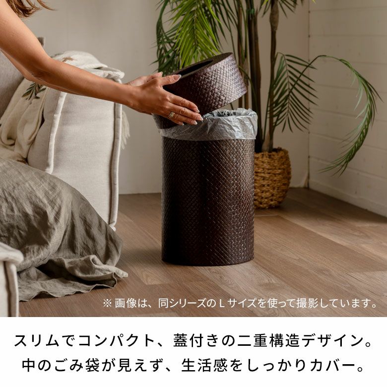 素材には、インドネシア・バリ島の職人が丁寧に編み上げた天然素材パンダンを使用。レザーのような艶と美しい編み目で、小さなサイズでも「ごみ箱らしさ」を感じさせません。二重構造によりごみ袋が外から見えず、来客時にも生活感を抑えます。