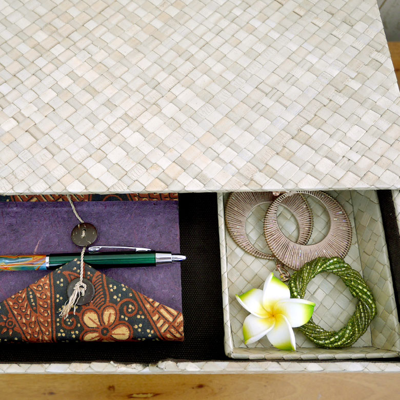 ・このパンダン製卓上3段チェストは、アジアンリゾート風のデザインが特徴
