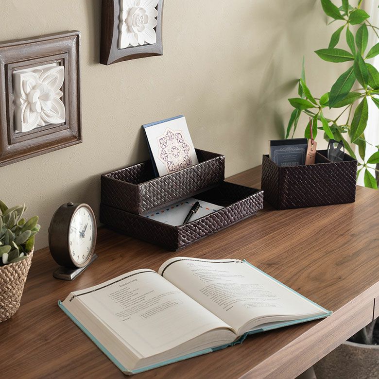 ペンや手帳を入れてデスクトップに重ねて置いたり、ダイニングテーブルに