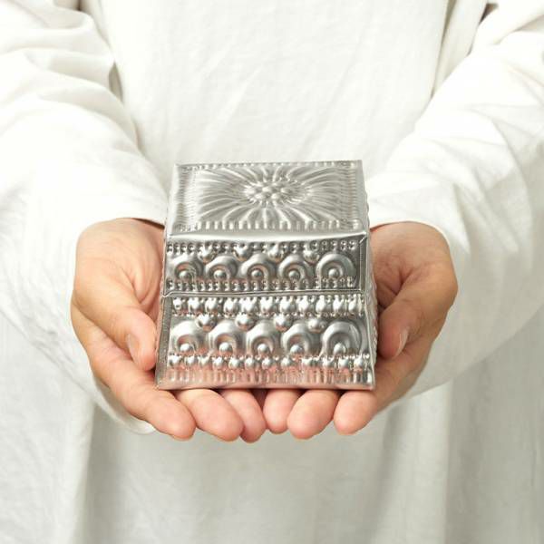 台形の形が珍しいアルミのケースは、軽くて見た目も華やかなデザイン。
