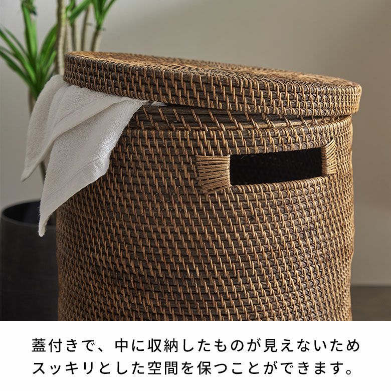 インドネシアの高品質な天然ラタンを使用し、バリ島の熟練した職人がハンドメイドで一つひとつ丁寧に仕上げたランドリーバスケット ランドリーバスケットやゴミ箱にも使えるアタとラタンで編まれたフタ付き大型バスケット(48リットル)[14177]