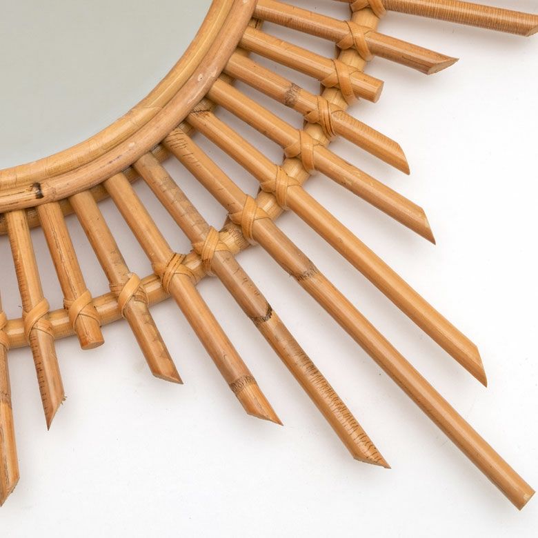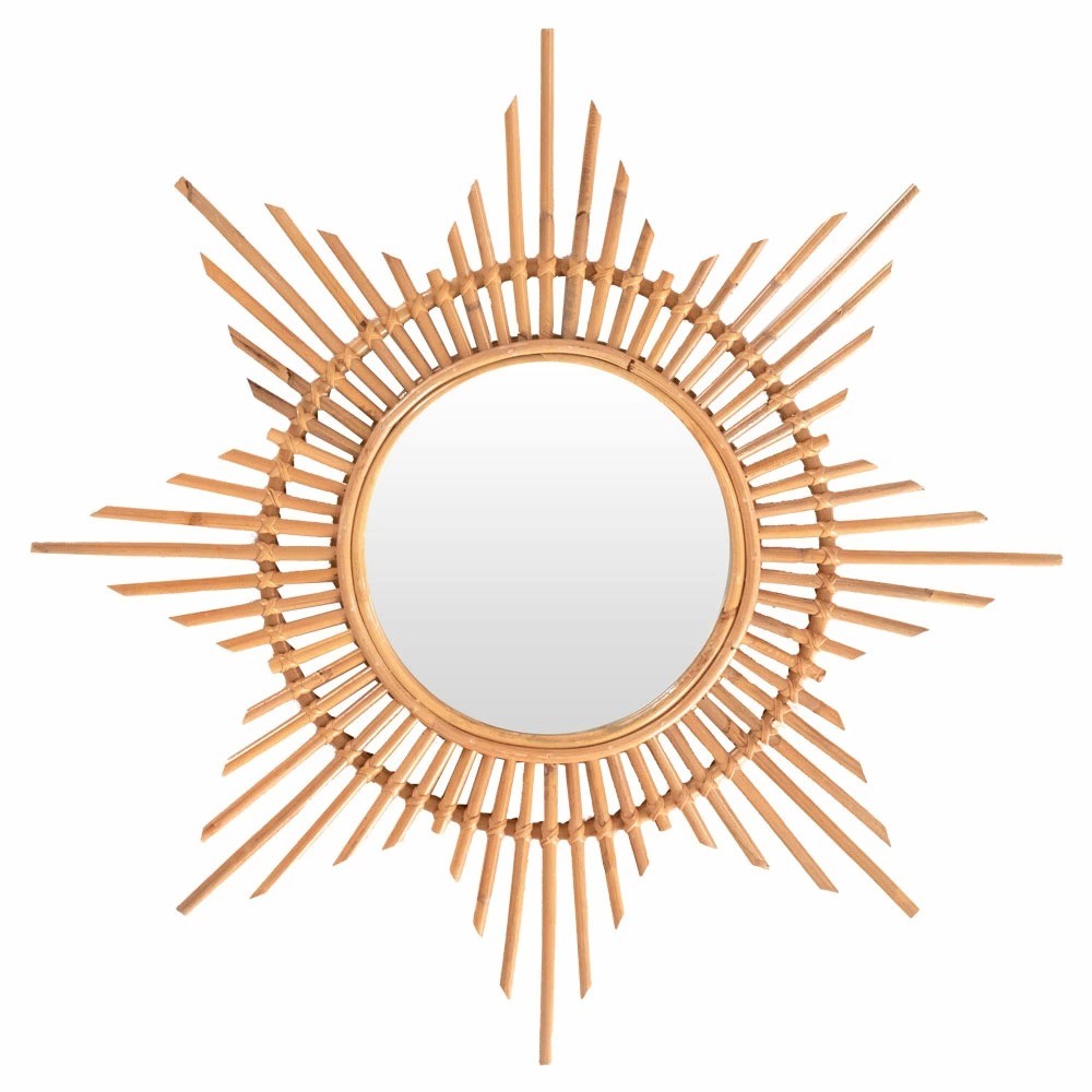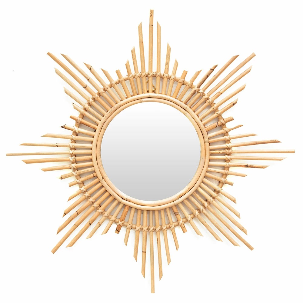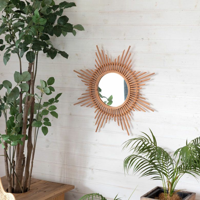 ラタン素材で縁取りをした、星型デザインの壁掛けミラー。