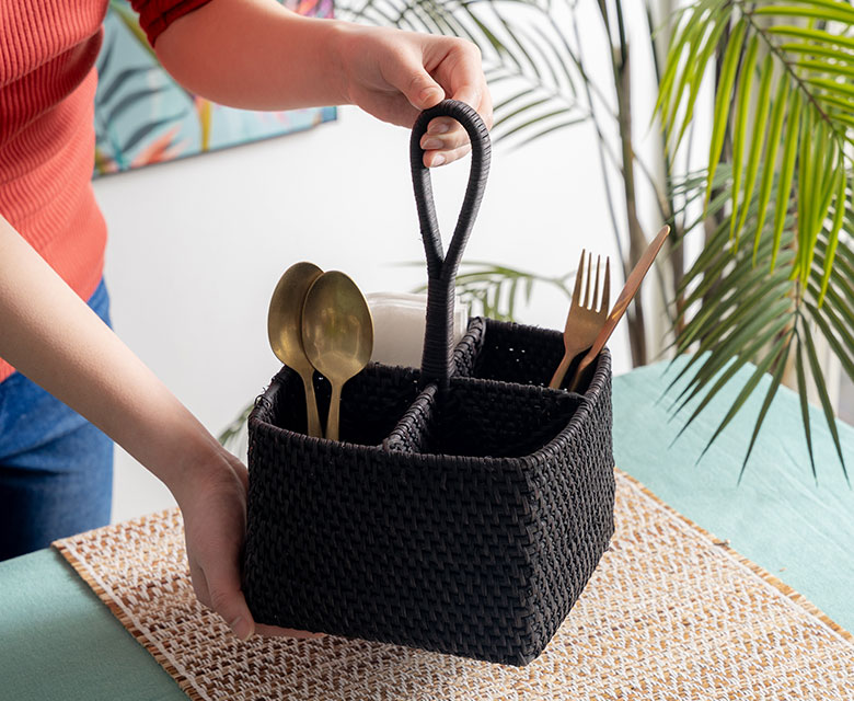 ラタンを染め上げ、編まれた大容量カトラリースタンド。