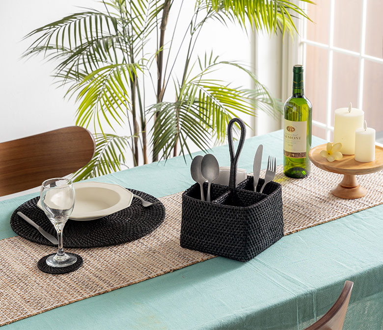 洗練されたテーブルコーディネートを作る、エスプレッソブラックカラーのラタンアイテム。