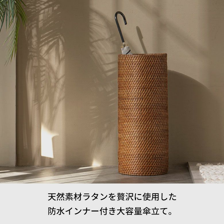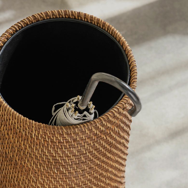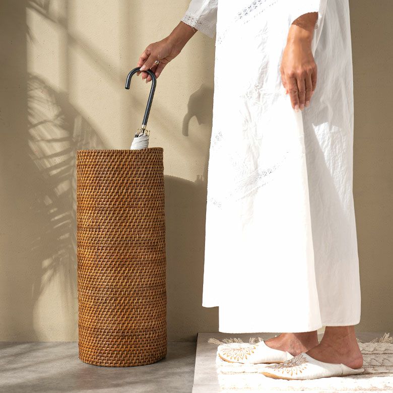 ラタン傘立てのやわらかな質感と自然な色合いが、木製家具やリネン、コットンなどの天然素材と調和し、心地よい玄関空間をつくります。