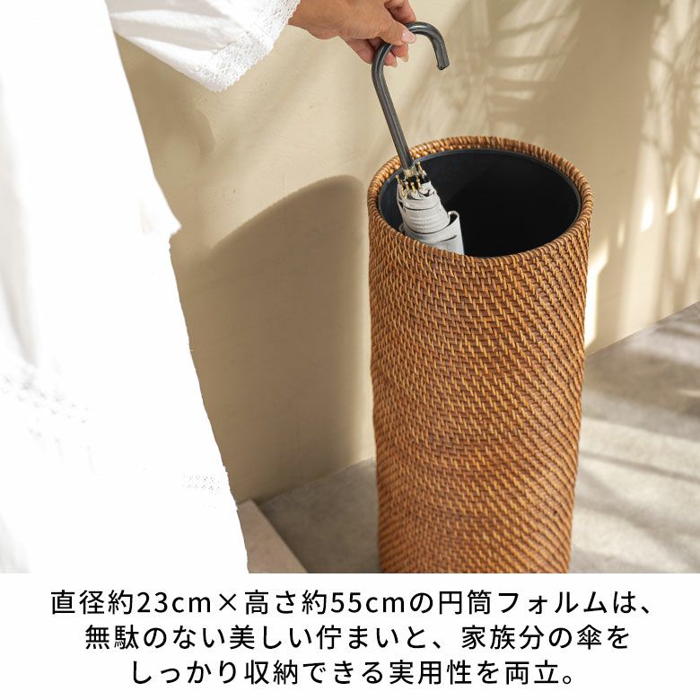 直径約23cm×高さ約55cmの円筒フォルムは、無駄のない美しい佇まいと、家族分の傘をしっかり収納できる実用性を両立。