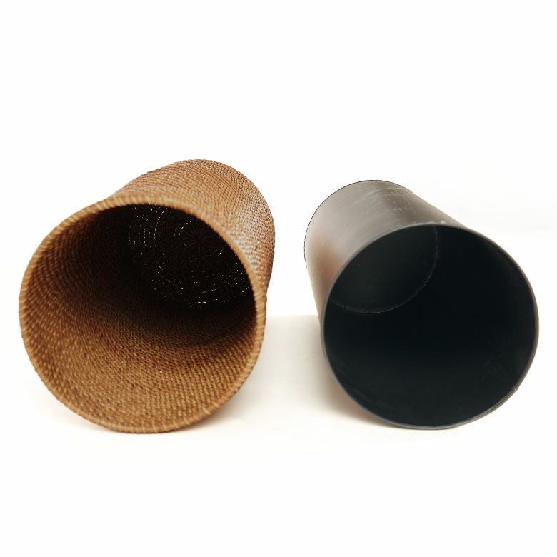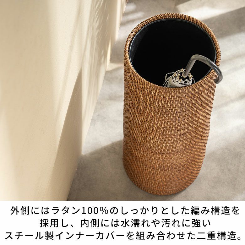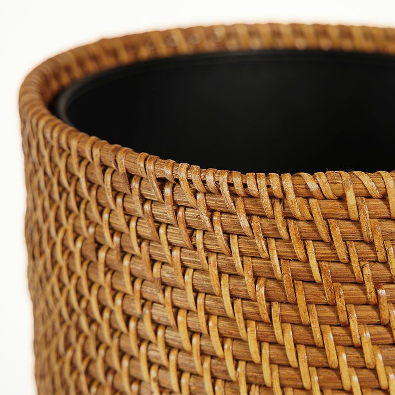 外側にはラタン100%のしっかりとした編み構造を採用し、内側には水濡れや汚れに強いスチール製インナーカバーを組み合わせた二重構造。