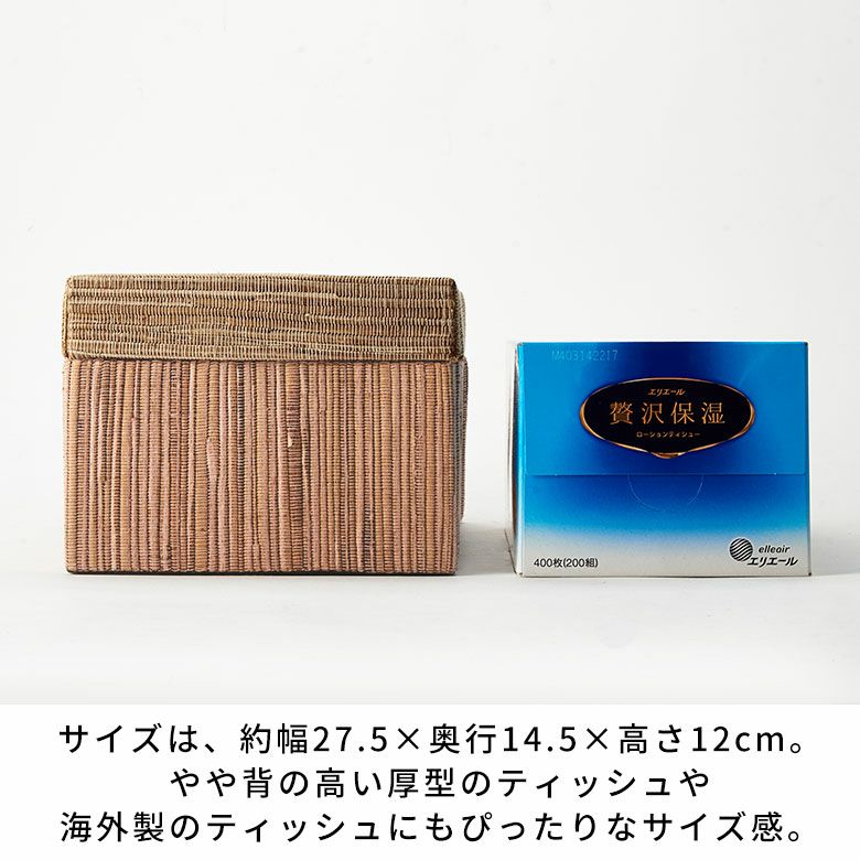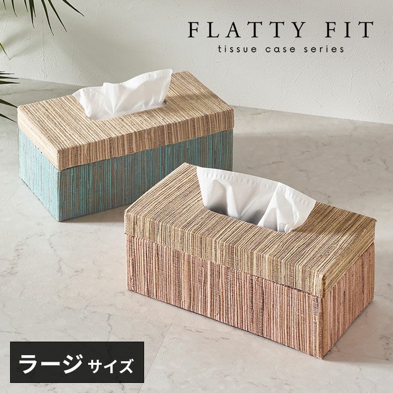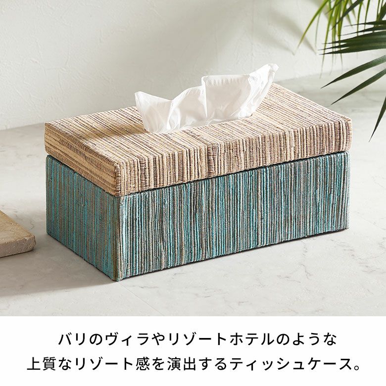 空間に温もりをプラスするピンク×ナチュラルと、爽やかな印象のブルー×ナチュラルのバイカラーがおしゃれな2色展開。約幅27.5×奥行14.5×高さ12cmのラージサイズは、やや背の高い厚型のティッシュや海外製のティッシュにもぴったりなサイズ感。薄型のボックスティッシュを2つ収納することもできます。ナチュラルでありながら、バリのヴィラやリゾートホテルのような上質なリゾート感を演出するアジアン雑貨です。