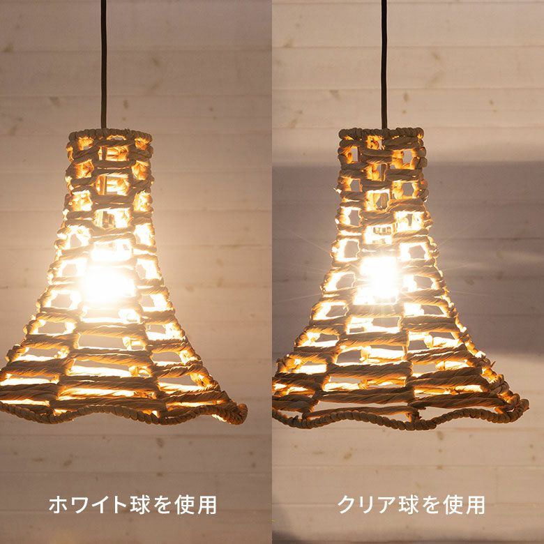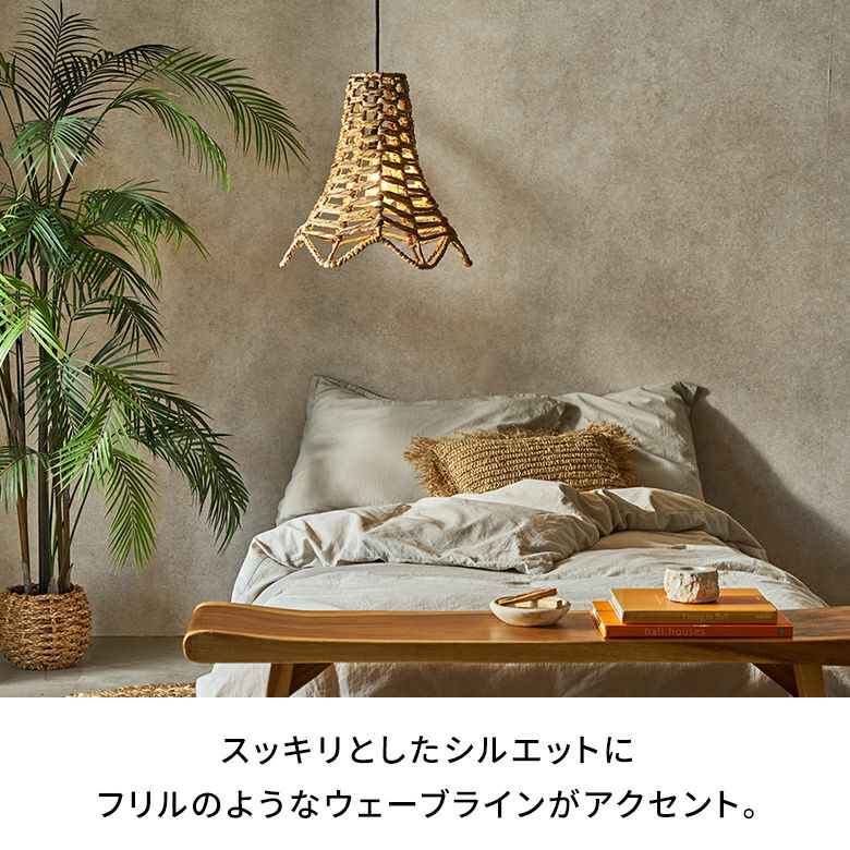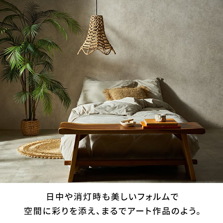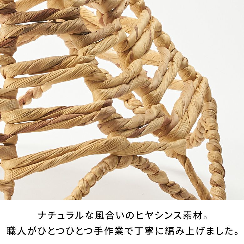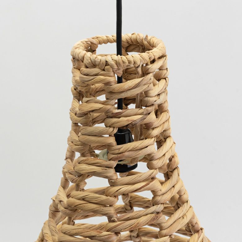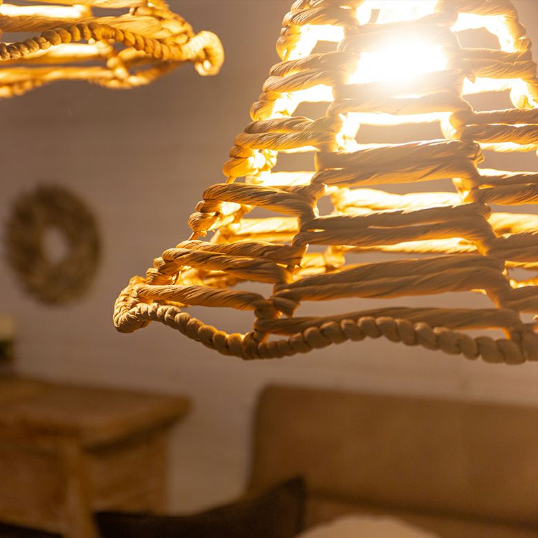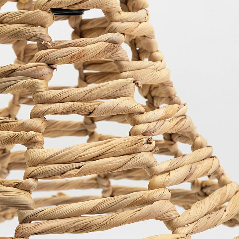 やわらかく優しい手触りのヒヤシンスを編み上げた、吊り下げ型のランプシェード。職人がひとつひとつ手作業で丁寧に編み上げました。どこか可愛らしさも感じるとんがり帽子のようなフォルムは、まるでアートのような佇まい。消灯時にもオブジェとしてインテリアのアクセントになってくれます。心地よいナチュラルな素材感で、リゾートスタイルやナチュラルテイストのお部屋にもマッチします。