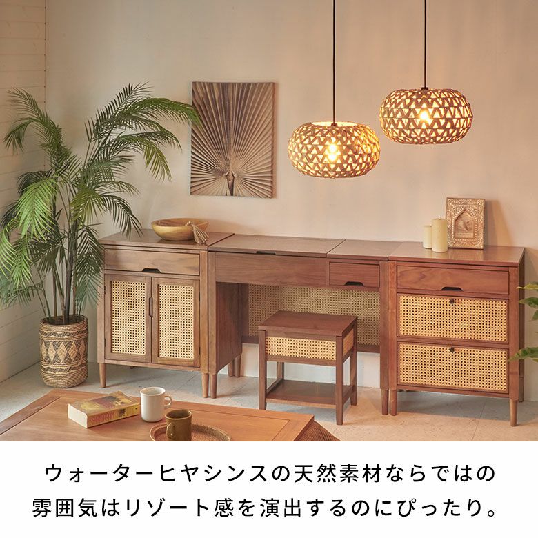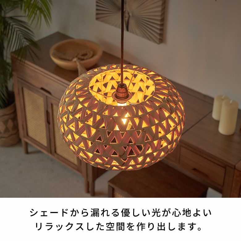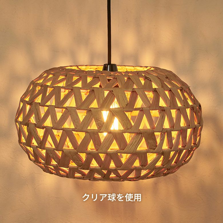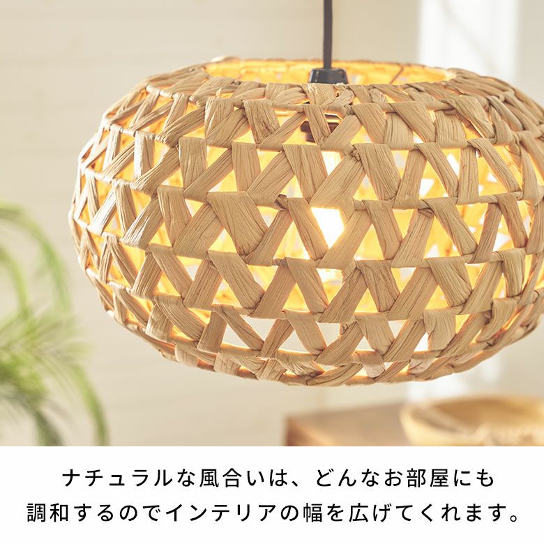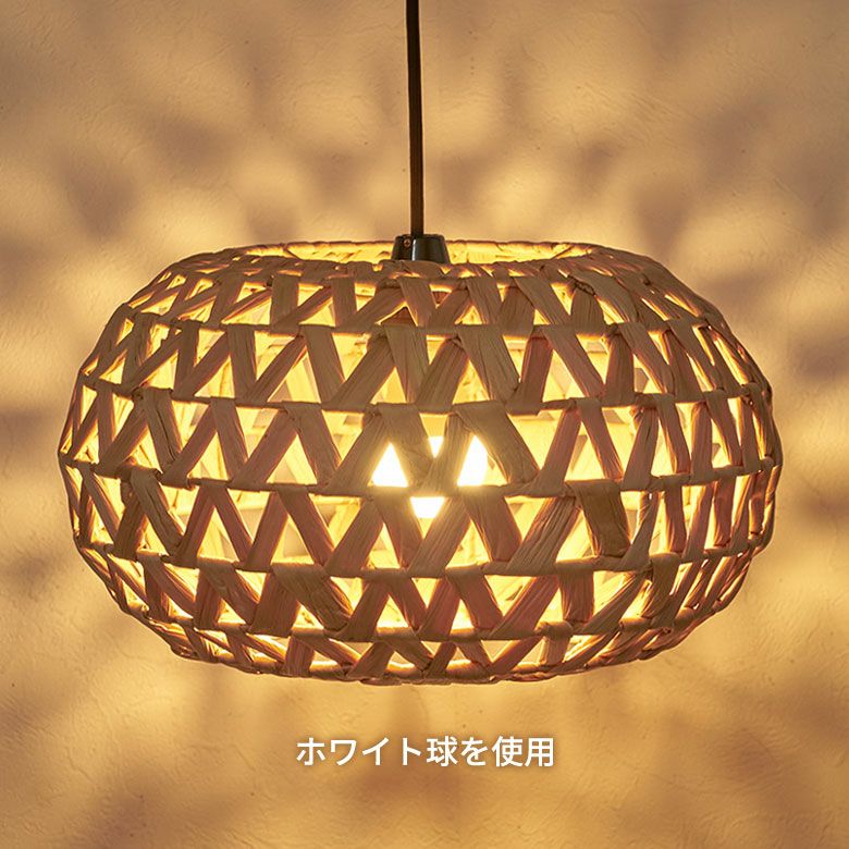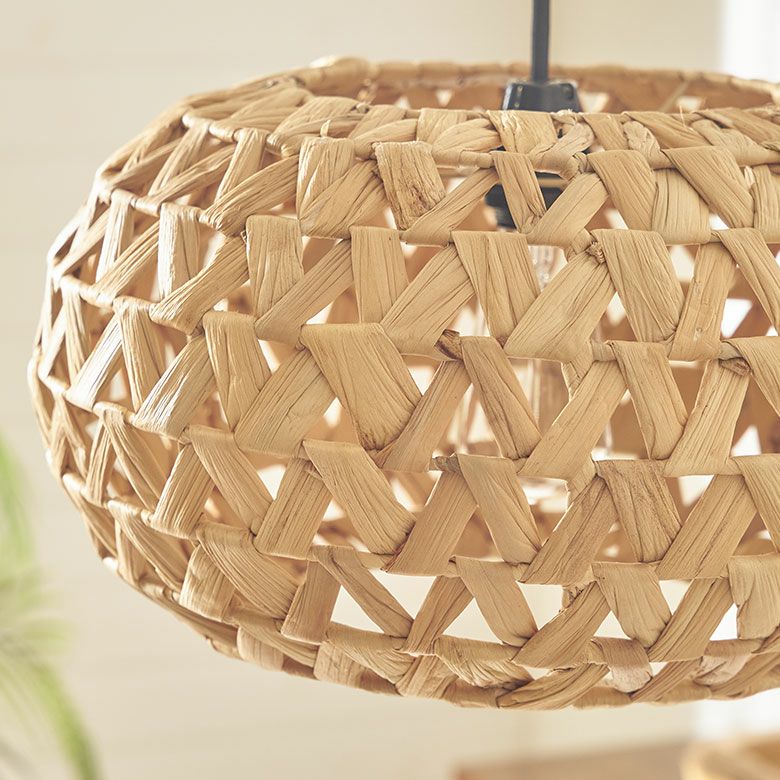 ベトナムの職人がひとつひとつ丁寧に編み上げ、ウォーターヒヤシンスの柔らかさを保ちながらもしっかりとした形状を維持して完成させました。自然素材ならではの雰囲気は、リゾート感を演出するのにぴったり。存在感のあるサイズなので、リビングやダイニング、寝室でメイン照明としてお使いいただけます。ホテルやアジアンテイストのカフェなど、店舗用の吊り下げ照明としてもおすすめです。