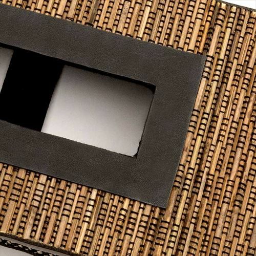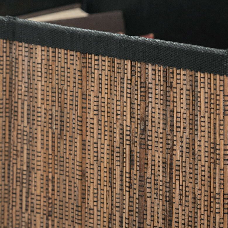 ヤシの葉の芯を乾燥させて細い棒状にし、黒い糸で編んで、すだれのように繋げたものも。