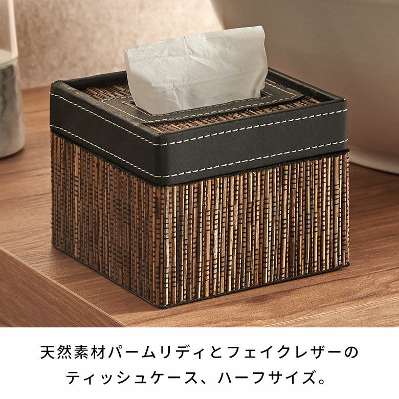 幅13.5×奥行13.5×高さ10cm。ハーフサイズのティッシュペーパーにぴったりなサイズ感。一般的なティッシュを二つにカットしてお使いいただくのもおすすめ。ナチュラルでありながら、バリのヴィラやリゾートホテルのような上質なリゾート感を演出するティッシュケースです。