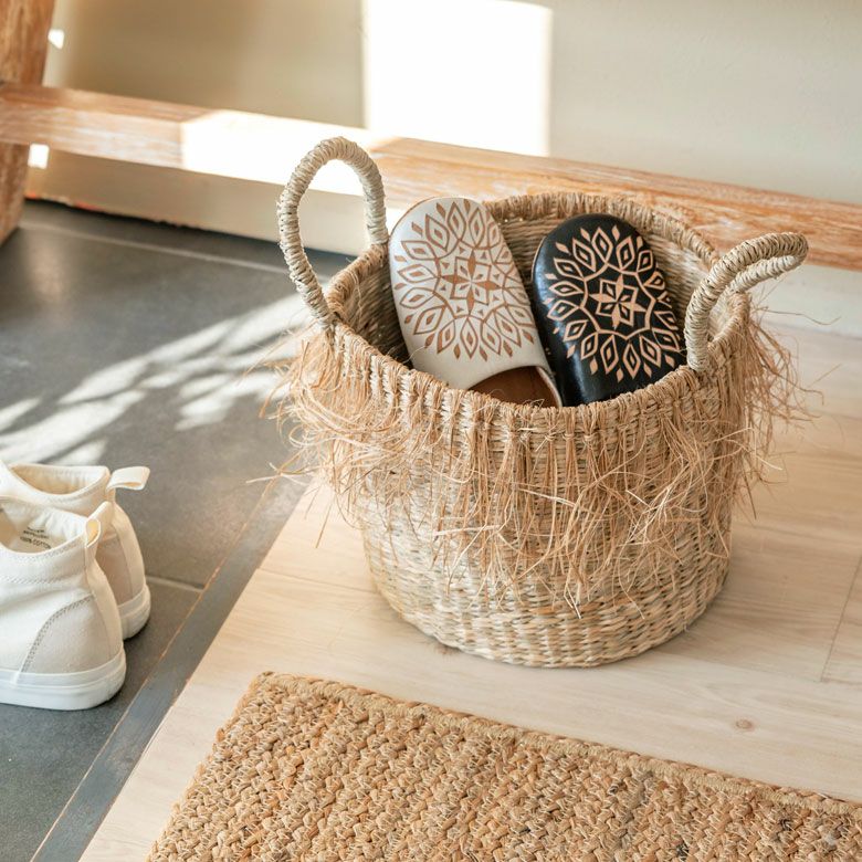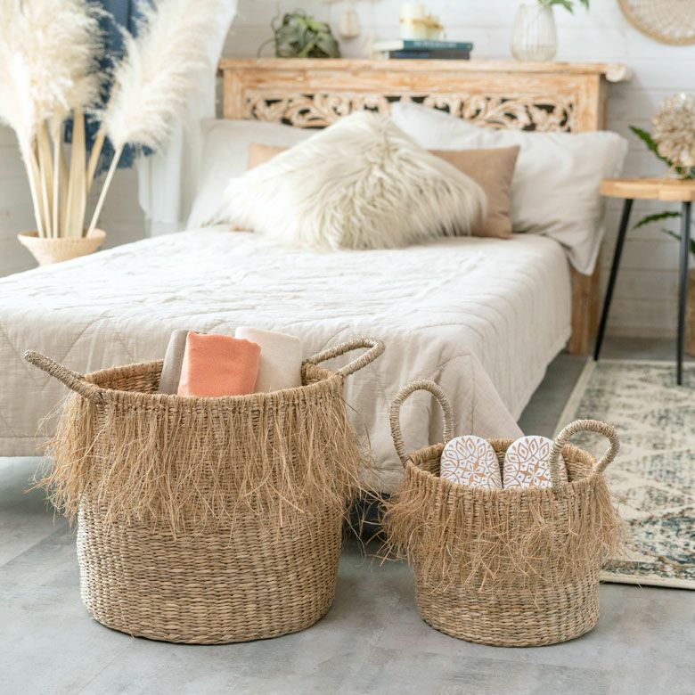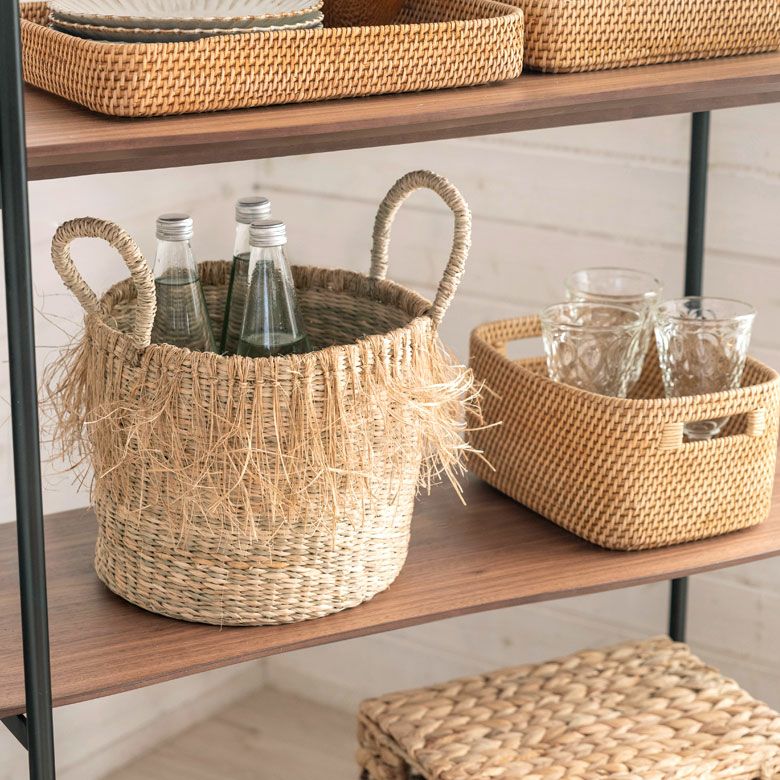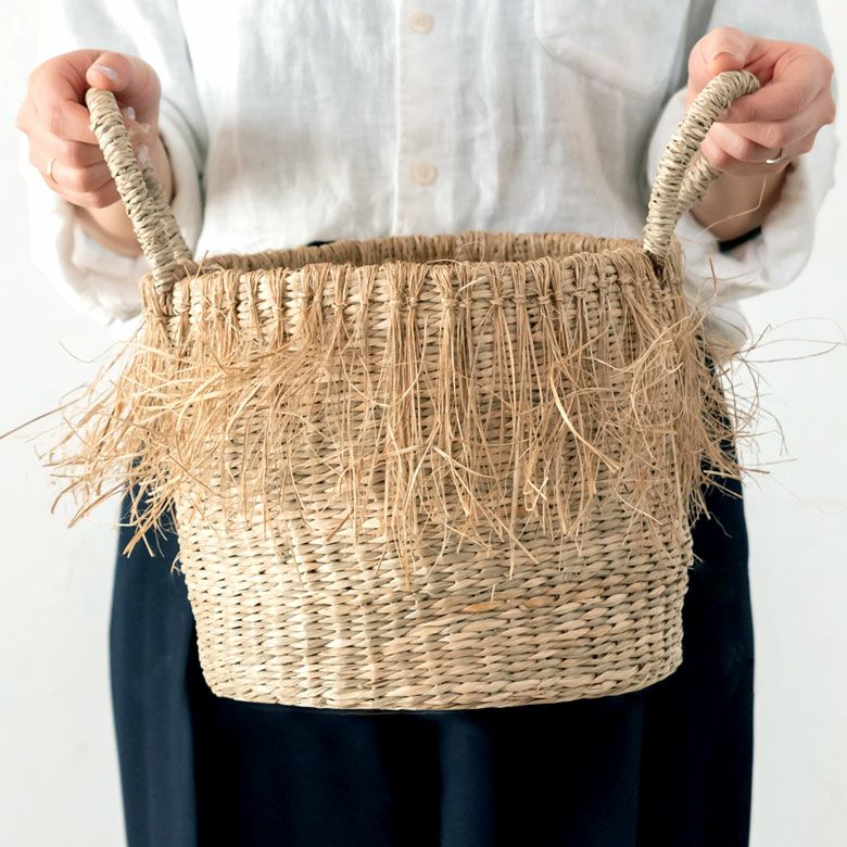 1つ1つ手作業でフリンジも一緒に丁寧に編みんだバスケット。