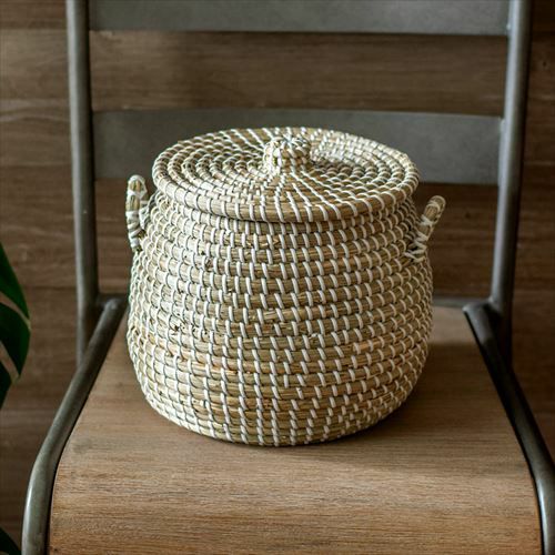 かごバスケット アフリカンバスケット シーグラスバスケット バスケット ふた付き 持ち手付き ポットタイプ アフリカ シーグラス製 丸型 25cm幅 Sサイズ[va51146]【 かごバスケット 収納 セネガルバスケット サイザルバスケット 蓋付き セネガルミニ 高さ24cm おしゃれ アジアン雑貨 アフリカン 】