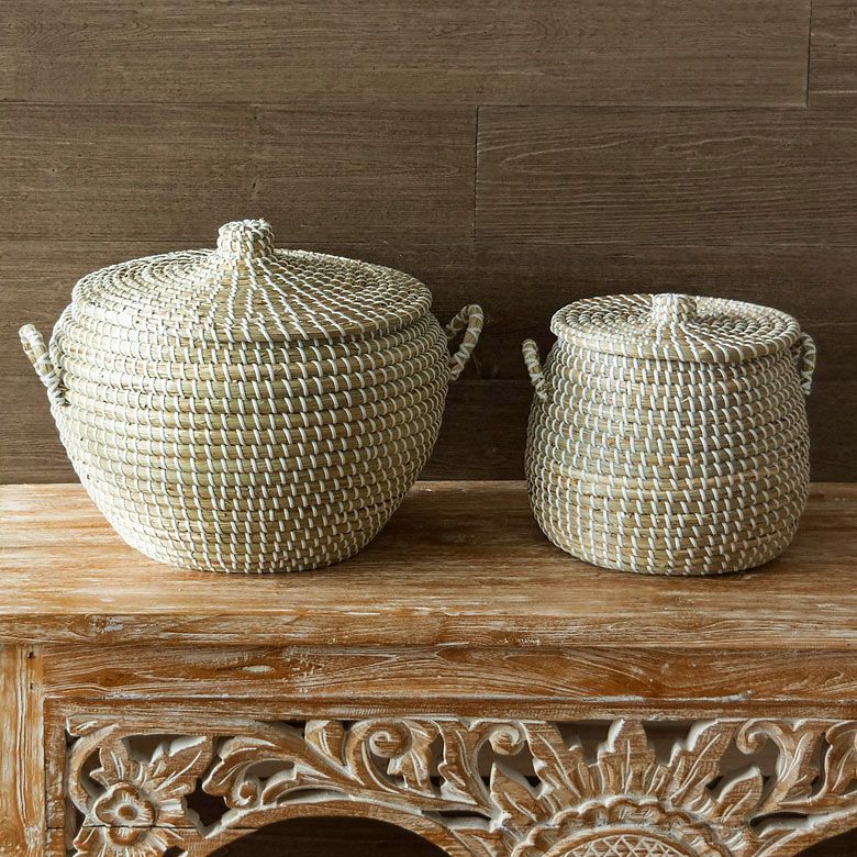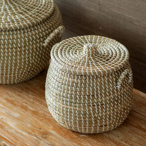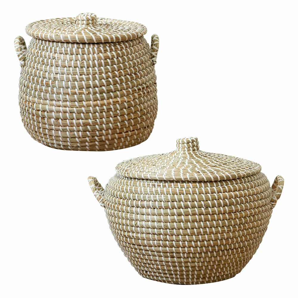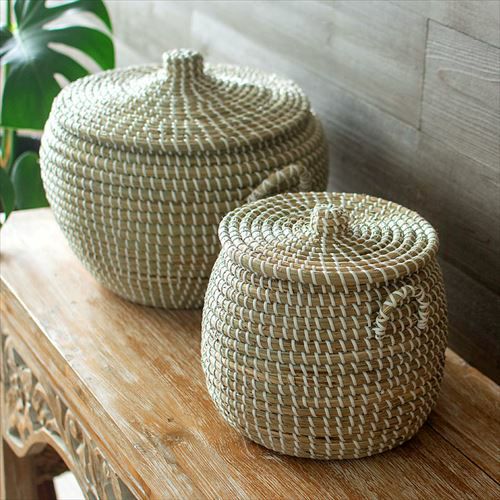 かごバスケット アフリカンバスケット シーグラスバスケット バスケット ふた付き 持ち手付き ポットタイプ アフリカ シーグラス製 丸型 35cm幅 SMサイズ2個SET[va51146 va51147]【 かごバスケット 収納 セネガルバスケット サイザルバスケット 蓋付き セネガルミニ 高さ30cm おしゃれ アジアン雑貨 アフリカン 】