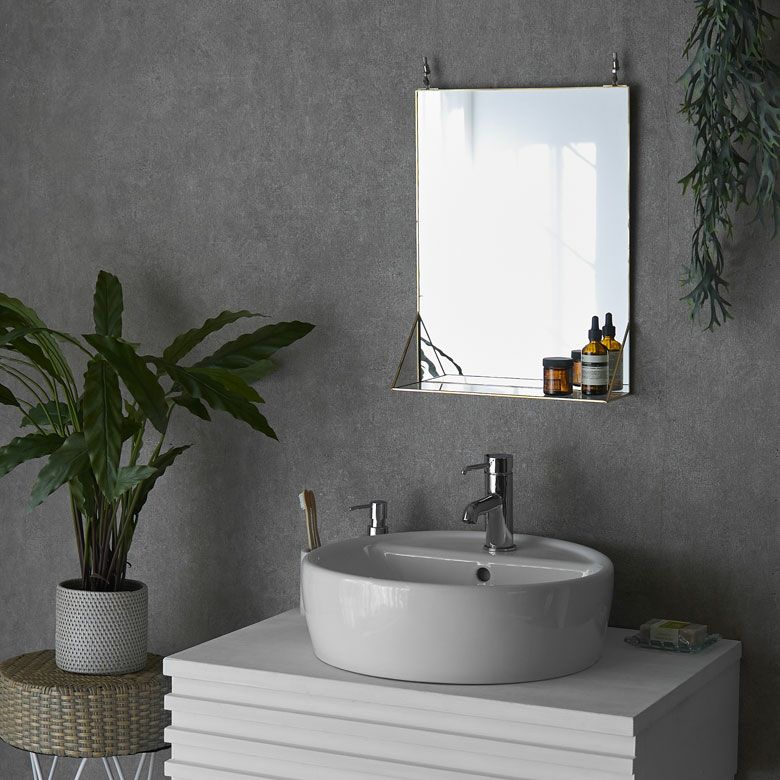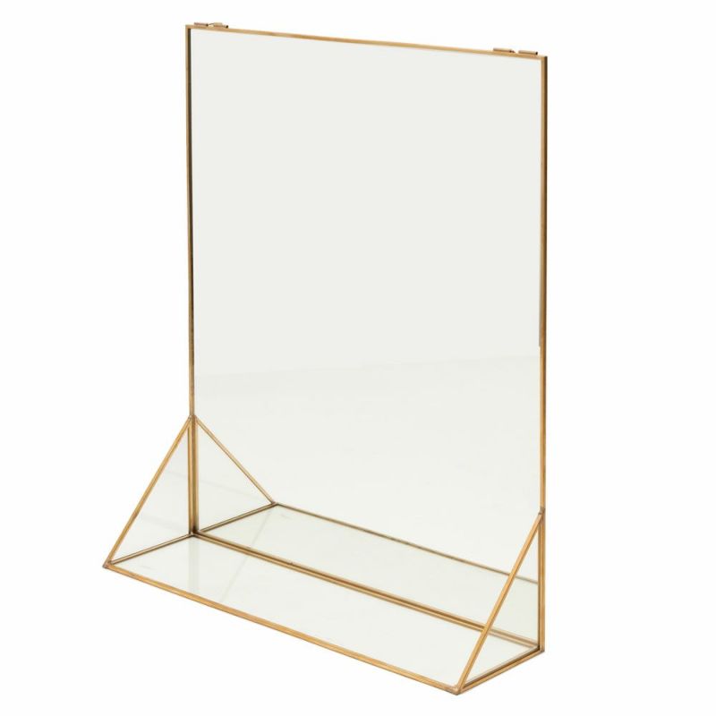 長方形の大型ミラーで、ガラスの台付きデザイン。