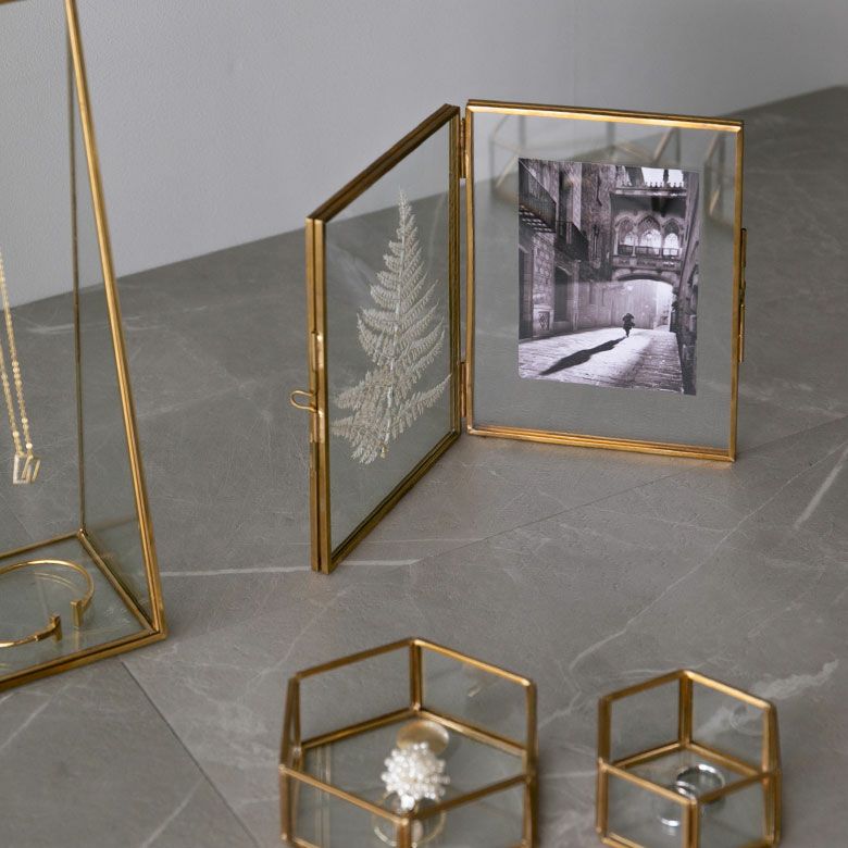 落ち着いたゴールドの真鍮フレームとガラスでできた