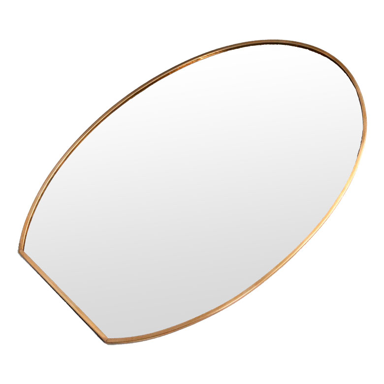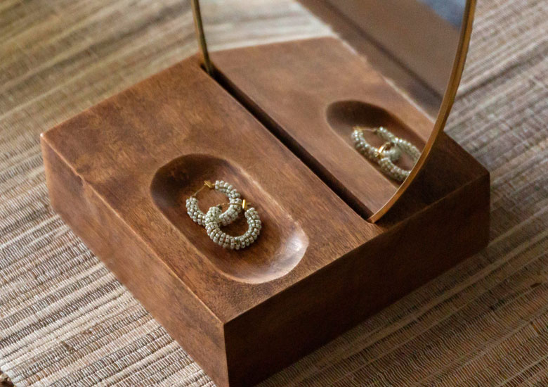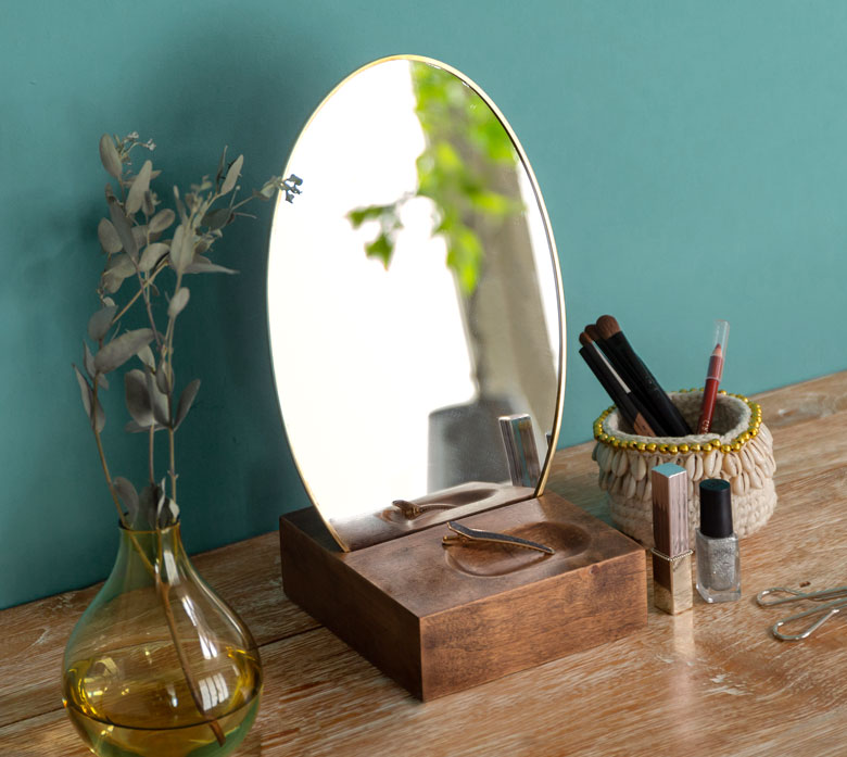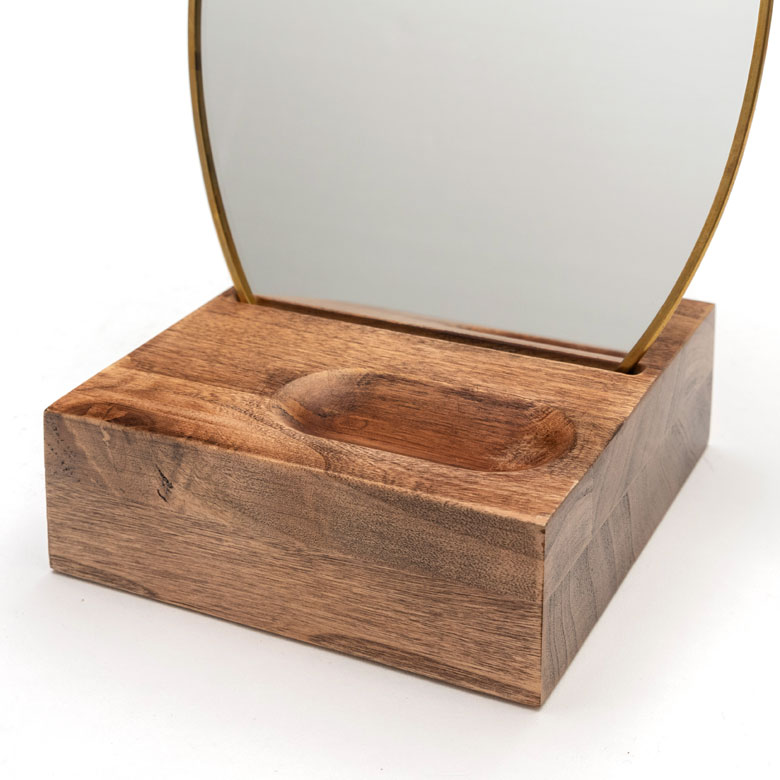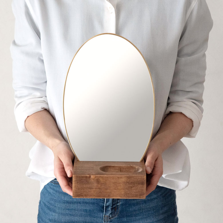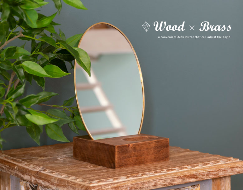 天然木のスタンドに、真鍮フレームのミラーを差し込んで使う、