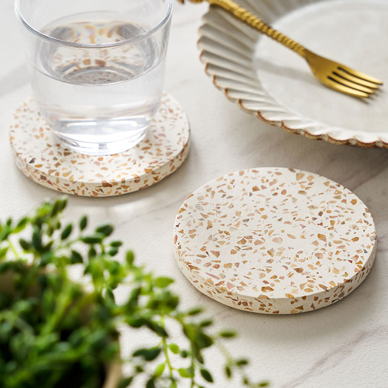 ![]() テラコッタブラウンのぺブルがミックスされた、テラゾーのコースター |