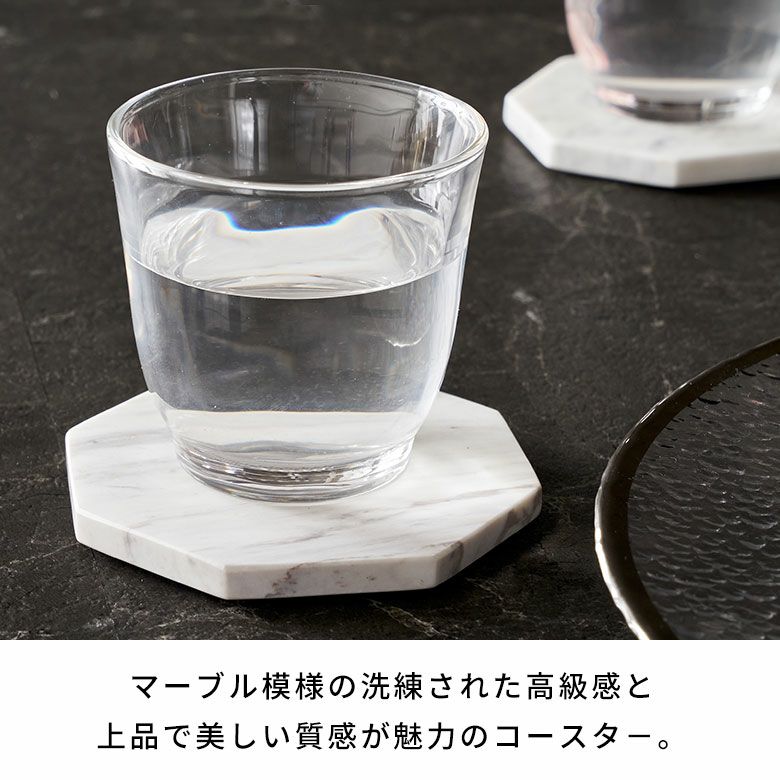 マーブル模様の洗練された高級感と上品で美しい質感が魅力のコースター 八角形の天然大理石のコースター2枚セット(ホワイトカララ)[14199]