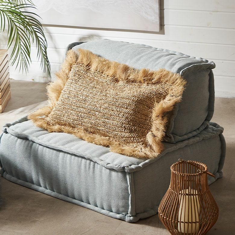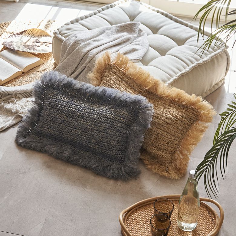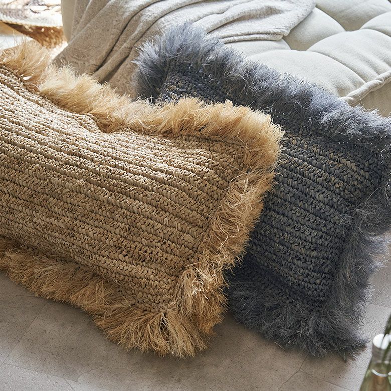 ・天然ラフィアを丁寧に編み上げたクッションカバーの長方形タイプ。涼しげな素材感ながら、お部屋に温かみと自然な雰囲気をプラスします。